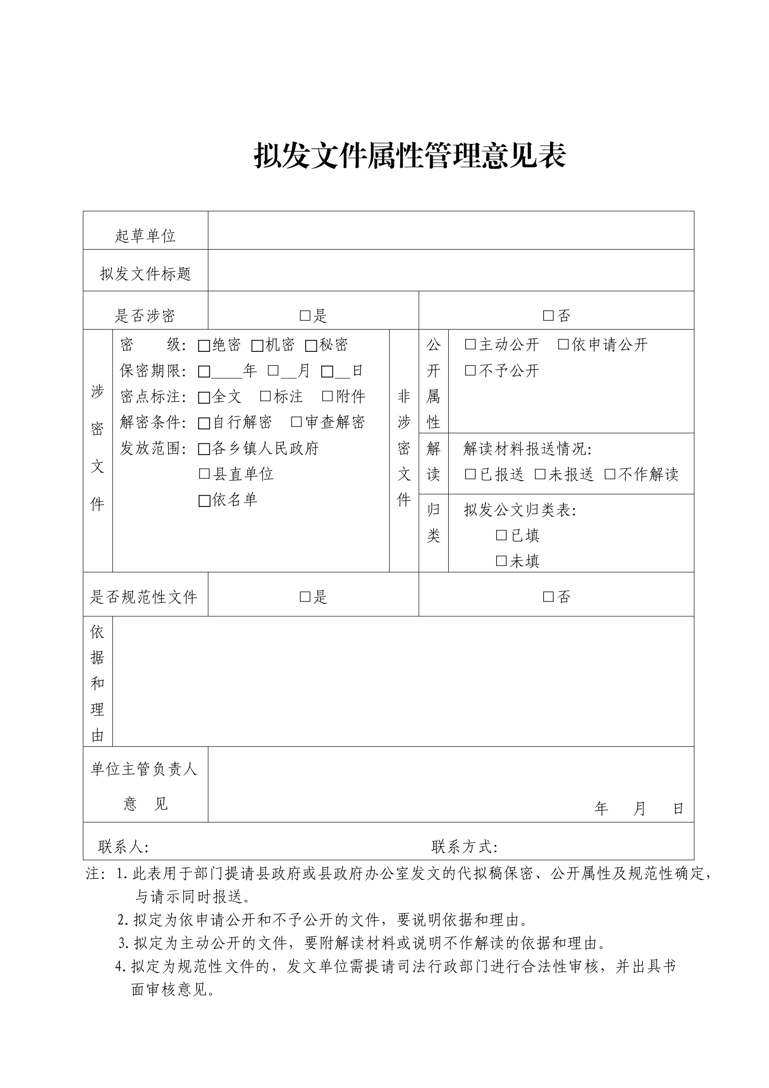 以县政府或县政府办公室名义印发的文件,起草单位要确定文件的公开属性并填写《拟发文件属性管理意见表》,同代拟稿件一同审批,无明确公开属性建议或未说明不主动公开依据和理由的,作退文处理。