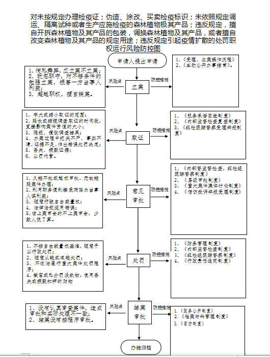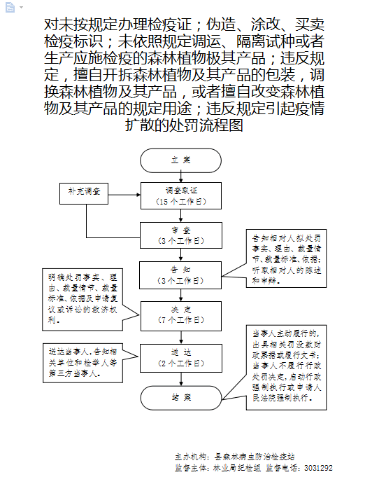 1、立案责任:发现未按规定办理检疫证;伪造、涂改、买卖检疫标识;未依照规定调运、隔离试种或者生产应施检疫的森林植物极其产品;违反规定,擅自开拆森林植物及其产品的包装,调换森林植物及其产品,或者擅自改变森林植物及其产品的规定用途;违反规定引起疫情扩散的违法行为,予以审查,决定是否立案。 2、调查责任:林业主管部门对立案的案件指定专人负责,及时组织调查取证。 3、审查责任:对取证材料进行认真核实,需补充取证的及时补证。 4、告知责任:作出行政处罚决定前,应制作《行政处罚告知书》送达当事人,告知违法事实及其享有的陈述、申辩等权利。 5、决定责任:作出行政处罚决定应严格审查。制作行政处罚决定书,应载明必备内容。 6、送达责任:行政处罚决定书按法律规定的方式送达当事人。 7、执行责任:依照生效的行政处罚决定,吊销许可证。 8、其他:法律法规规章规定应履行的责任。 |