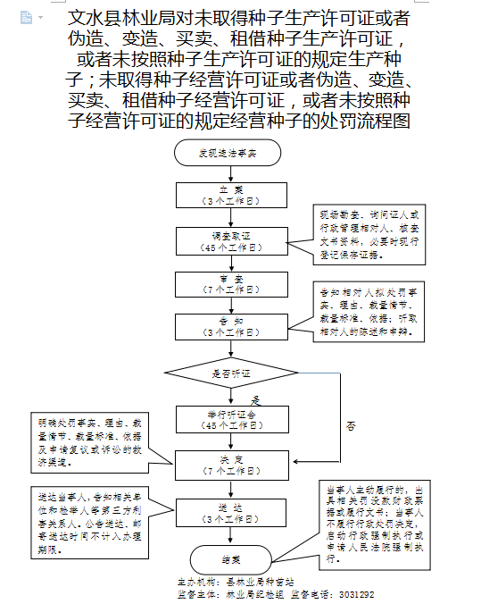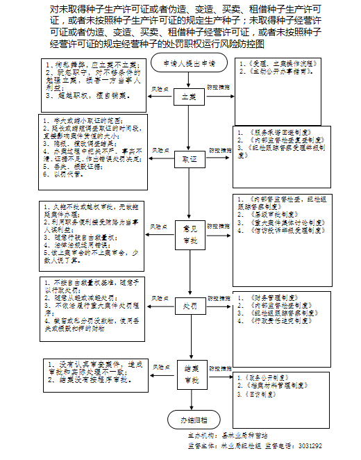 1、立案责任:发现未取得种子生产许可证或者伪造、变造、买卖、租借种子生产许可证,或者未按照种子生产许可证的规定生产种子;未取得种子经营许可证或者伪造、变造、买卖、租借种子经营许可证,或者未按照种子经营许可证的规定经营种子的违法行为,予以审查,决定是否立案。 2、调查责任:林业主管部门对立案的案件指定专人负责,及时组织调查取证。 3、审查责任:对取证材料进行认真核实,需补充取证的及时补证。 4、告知责任:作出行政处罚决定前,应制作《行政处罚告知书》送达当事人,告知违法事实及其享有的陈述、申辩等权利。 5、决定责任:作出行政处罚决定应严格审查。制作行政处罚决定书,应载明必备内容。 6、送达责任:行政处罚决定书按法律规定的方式送达当事人。 7、执行责任:依照生效的行政处罚决定,吊销许可证。 8、其他:法律法规规章规定应履行的责任。 |