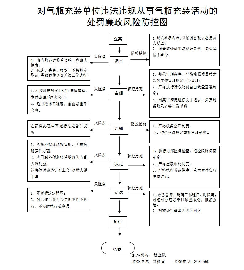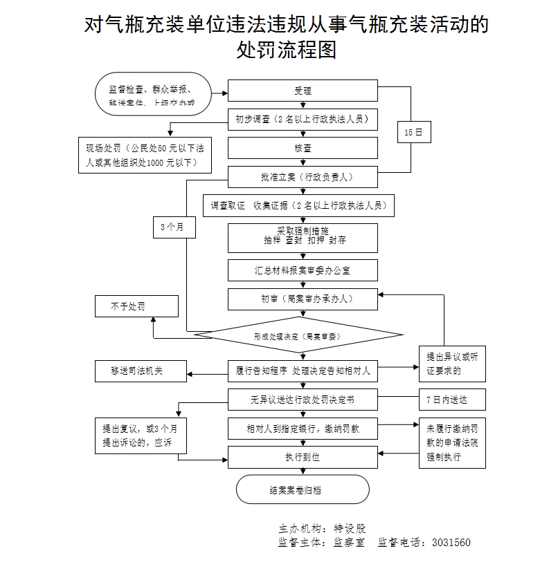 1、立案责任:质量技术监督部门对依据监督检查职权或者通过举报、投诉、其他部门移送、上级部门交办等途径发现的违法行为线索,自发现之日起15日内组织核查,并决定是否立案。 2、调查责任:调查取证时,案件承办人员不得少于两人,向当事人或者有关人员出示行政执法证件,并记录在案。现场检查情况如实记入现场检查笔录,由当事人签署意见,并签名或者盖章。允许当事人陈述申辩,并将当事人的陈述申辩理由记录在案。 3、审查责任:案件审查委员会办公室和案审会对案件的违法事实、收集的证据、办案的程序、法律适用、处罚种类和幅度、当事人的陈述申辩理由等进行审查,提出处理意见(主要证据不足时,退回案件承办机构补充调查)。 4、告知责任:在送达行政处罚告知书的同时,告知当事人享有陈述申辩和要求听证等权力。 5、决定责任:质监部门根据案件审理情况和告知后当事人的陈述申辩理由决定是否予以行政处罚。依法需要给予行政处罚的,制作行政处罚决定书,载明违法事实和证据、处罚依据和内容、申请行政复议和提起行政诉讼的途径和期限等内容。行政处罚案件自立案之日起应当在3个月内作出处理决定,案情复杂不能按期作出处理决定的,按规定程序办理延长时间手续。 |