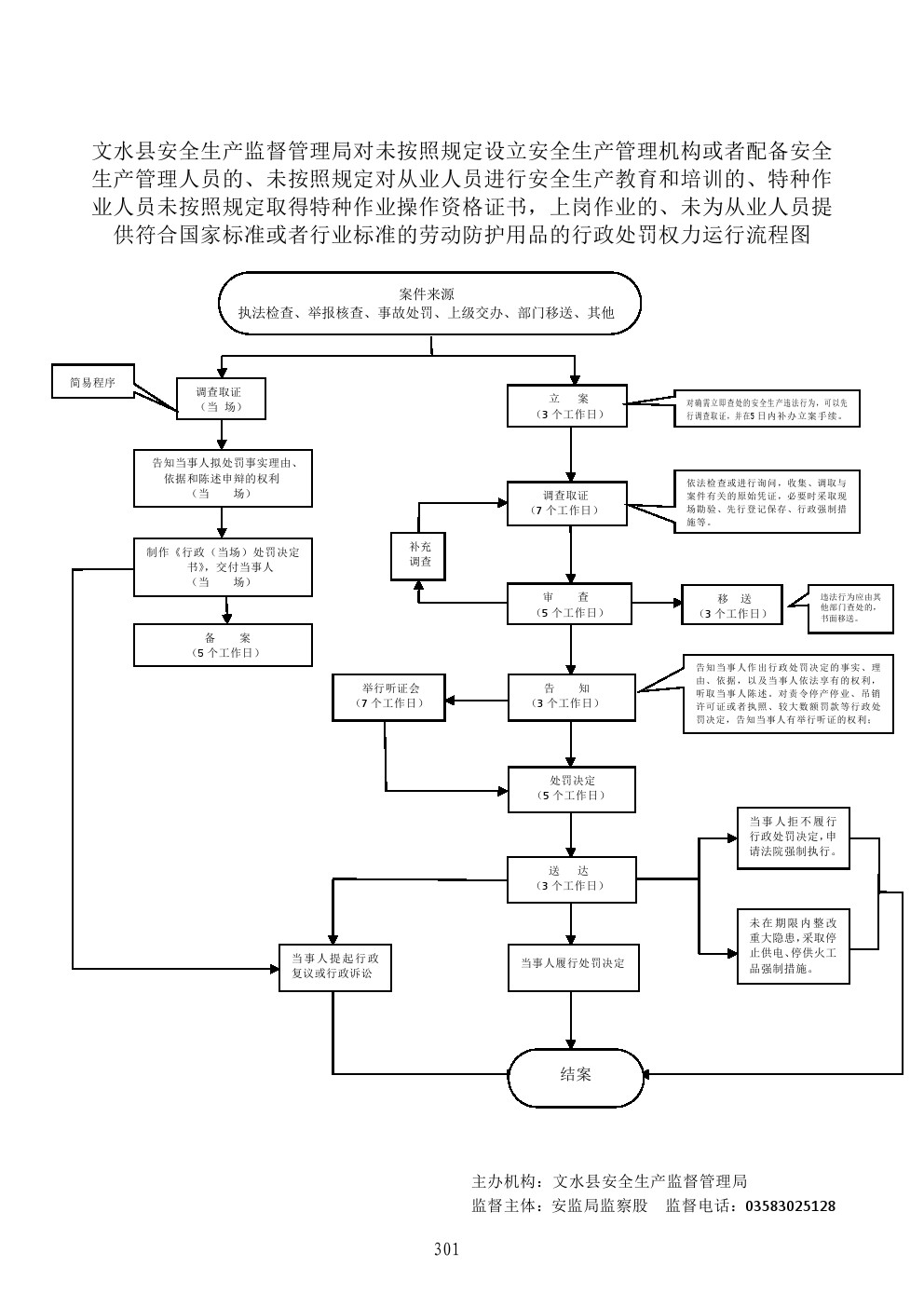 1、立案责任:在检查中或者事故调查过程中发现、或者接到举报、或部门移交的违法案件,予以审查,决定是否立案。 2、调查责任:对已经立案的案件,进行调查时,执法人员不得少于两人,与当事人有直接利害关系的应当回避。调查时应出示执法证件,收集相关证据,允许当事人辩解陈述,执法人员应保守有关秘密。 3、审查责任:对案件违法事实、证据、调查取证程序、法律适用、处罚种类和幅度、当事人陈述和申辩理由等方面进行审查,提出处理意见。 4、告知责任:在做出行政处罚决定前,制作《行政处罚告知书》,符合听证条件的制作《听证告知书》,通知当事人,当事人享有的陈述、申辩、要求听证的权利。 5、决定责任:根据审理情况决定是否予以行政处罚。依法需要给予行政处罚的,制作《行政处罚决定书》,载明违法事实和证据、处罚依据和内容、缴纳罚款的银行、申请行政复议或提起行政诉讼的途径和期限等内容。 6、送达责任:《行政处罚决定书》按照法定的方式和期限送达当事人。 7、执行责任:监督当事人在决定的期限内,履行生效的处罚决定。当事人在法定期限内不申请行政复议或者提起行政诉讼,又不履行的,发出催缴通知,加收罚款滞纳金,再不履行的向人民法院申请强制执行。 |